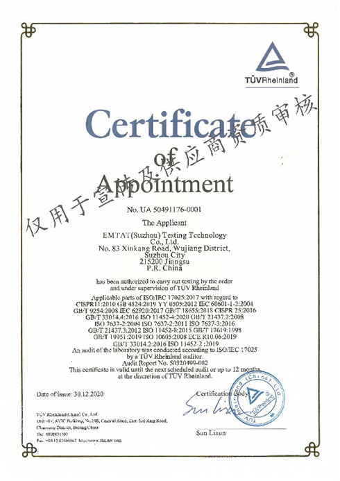 中国CNAS与国际实验室认可合作组织(ILAC)互认,通过CNAS认可的实验室所出具的检测报告可加盖国家实验室认可委员会(CNAS)和ILAC的印章,所出具的数据具有法律效力、国际互认。CNAS认可证书能够强有力地证明苏州测通实验室的检测能力。
